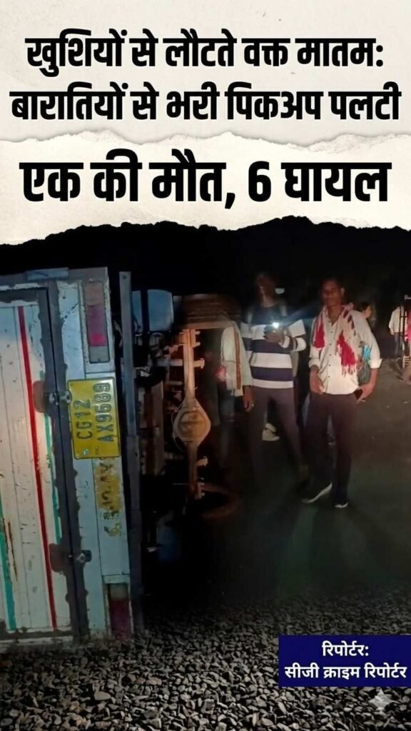 यह घटना बिलासपुर जिले के सीपत थाना क्षेत्र अंतर्गत करमा और पोड़ी के बीच एक मोड़ पर हुई। बताया जा रहा है कि पिकअप वाहन में सवार लोग बारात में शामिल होने के लिए छप्पर गए थे और वहां से लौटते समय यह हादसा हो गया।