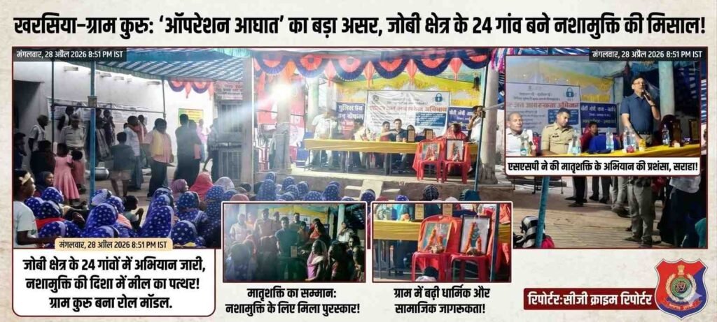 रायगढ़, 28 अप्रैल 2026। जिले के अंतिम छोर स्थित खरसिया तहसील के ग्राम पंचायत कुरू में मंगलवार को जन-जागरूकता, नशामुक्ति और सामाजिक चेतना को लेकर एक विशेष शिविर का आयोजन किया गया। पुलिस चौकी जोबी द्वारा आयोजित इस कार्यक्रम में वरिष्ठ पुलिस अधीक्षक शशि मोहन सिंह मुख्य अतिथि के रूप में शामिल हुए। ग्रामीणों ने उनका आत्मीय स्वागत किया और पूजा-अर्चना के साथ कार्यक्रम की शुरुआत हुई।