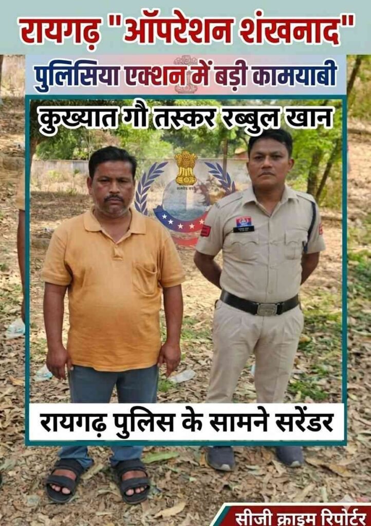 रायगढ़, 29 अप्रैल 2026। रायगढ़ पुलिस द्वारा गौ तस्करी के खिलाफ चलाए जा रहे विशेष अभियान “ऑपरेशन शंखनाद” के तहत एक बड़ी सफलता सामने आई है। लंबे समय से फरार चल रहा कुख्यात गौवंश तस्कर रब्बुल खान आखिरकार पुलिस के बढ़ते दबाव के चलते सरेंडर करने को मजबूर हो गया।