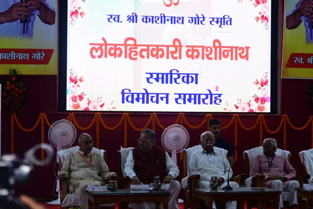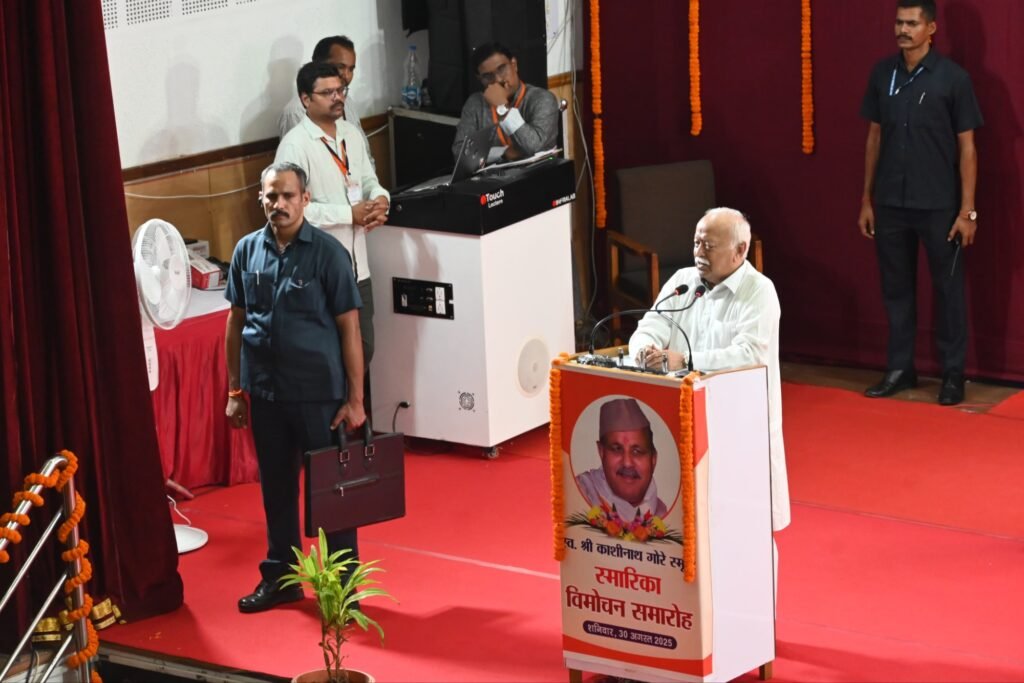 बिलासपुर : शनिवार 30 अगस्त 2025 को छत्तीसगढ़ के बिलासपुर स्थित छत्तीसगढ़ आयुर्विज्ञान संस्थान प्रेक्षागृह में राष्ट्रीय स्वयंसेवक संघ के पूर्व विभाग संघचालक स्व. काशीनाथ गोरे जी के जीवन कृतित्व पर केंद्रित स्मारिका का विमोचन पूजनीय सरसंघचालक श्री डॉ मोहन भागवत जी के करकमलों से संपन्न हुआ। कार्यक्रम का शुभारंभ सांघिक गीत व भारत माता के चित्र पर दीप प्रज्जवलन से हुआ। स्मारिका विमोचन समिति के सचिव श्री विश्वास जलताड़े ने मंचस्थ अतिथियों का परिचय कराया। इस अवसर पर पूजनीय सरसंघचालक डॉ मोहन भागवत जी ने अपने उद्बोधन में कहा,बिलासपुर जब भी आया श्री काशीनाथ जी की उपस्थिति अवश्य रहती थी. काशीनाथ जी गोरे संघ के स्वयंसेवक थे, ऐसा कहेंगे तो भी उनके जीवन का वर्णन पूर्ण हो जाता है, क्योंकि आद्य सरसंघचालक डॉक्टर साहब कहा करते थे, स्वयंसेवक का व्यक्तित्व ऐसा होता है जो लोगों को आकर्षित करता है।