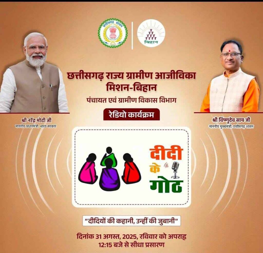 बिलासपुर, 30 अगस्त 2025-मुख्यमंत्री श्री विष्णुदेव साय के नेतृत्व में सुशासन की सरकार ने छत्तीसगढ़ की ग्रामीण महिलाओं को सामाजिक, आर्थिक और पारिवारिक रूप से सशक्त बनाने की दिशा में एक और ऐतिहासिक कदम बढ़ाया है। राज्य ग्रामीण आजीविका मिशन (बिहान) के अंतर्गत तैयार विशेष रेडियो कार्यक्रम “दीदी के गोठ” का शुभारंभ 31 अगस्त 2025 को दोपहर 12:15 बजे किया जाएगा। यह कार्यक्रम आकाशवाणी रायपुर केंद्र सहित प्रदेश के सभी आकाशवाणी केंद्रों से एक साथ प्रसारित होगा। साथ ही इसकी लाइव स्ट्रीमिंग ऑनलाइन प्लेटफॉर्म (www.onlineradiofm.in/stations/all-india-air-raipur) पर भी उपलब्ध रहेगी,आकाशवाणी के बिलासपुर केंद्र से इस प्रसारण को 103.2 मेगा हर्ट्ज सुना जा सकेगा साथ ही लाइव स्ट्रीमिंग www.onlineradiofm.in/stations/all-india-air-Bilaspur के जरिए भी लोग कार्यक्रम से जुड़ सकेंगे।