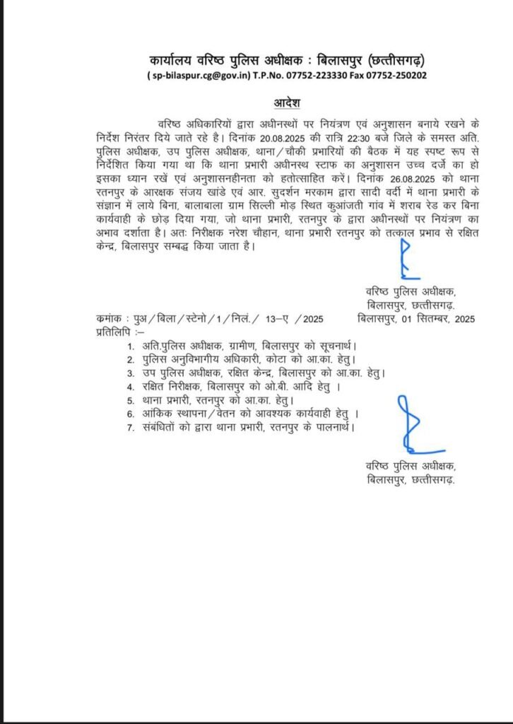 वरिष्ठ पुलिस अधीक्षक,रजनेश सिंह के द्वारा रतनपुर थाना प्रभारी नरेश चौहान को अपने अधीनस्थ स्टाफ पर नियंत्रण न रख पाने के कारण तत्काल ही रक्षित केंद्र का आदेश जारी किया,,, आपको बता दे बिलासपुर वरिष्ठ पुलिस अधीक्षक रजनेश सिंह के द्वारा जिस प्रकार चेतना का एक सफल अभियान चलाया जा रहा है,,, जिसमें जनता अपने आप को सुरक्षित जागरूक व पुलिस और जनता के बीच में अटूट संबंध लगातार बढ़ते जा रहे हैं,,, तो वहीं एसएसपी की इस कार्रवाई से समाज व अधिकारी कर्मचारियों में अपने कार्य को गंभीरता से नजर आ रहे हैं,, वही ऐसी कार्रवाई होने से समाज को एक अच्छी और बेहतर पुलिसिंग सेवा का अवसर प्राप्त भी होगा!