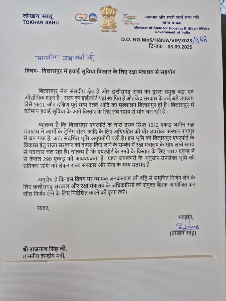 इस मुद्दे के समाधान के लिए श्री साहू ने रक्षा मंत्री श्री राजनाथ सिंह से अनुरोध किया कि छत्तीसगढ़ सरकार और रक्षा मंत्रालय के अधिकारियों की एक संयुक्त बैठक बुलाई जाए। उनका मानना है कि संवाद और सहयोग से कोई ठोस समाधान निकलेगा, जिससे बिलासपुर में हवाई सेवाओं के विस्तार का मार्ग प्रशस्त होगा। यह कदम न केवल क्षेत्रीय परिवहन सुविधा को बेहतर बनाएगा बल्कि शहर के आर्थिक और सामाजिक विकास के लिए भी अहम साबित होगा।