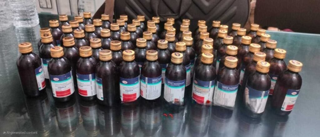 बिलासपुर। थाना कोटा पुलिस और एसीसीयू टीम ने संयुक्त कार्रवाई करते हुए ग्राम कलमीटार रेलवे अंडरब्रिज के पास से दो आरोपियों को गिरफ्तार किया है। दोनों आरोपियों – धरमदास यादव (30 वर्ष) और सुनील साहू (38 वर्ष) – के पास से कुल 69 नग ONEREX कफ सिरप की शीशियां (6900 ML, कीमत लगभग ₹6900/-) बरामद की गईं।