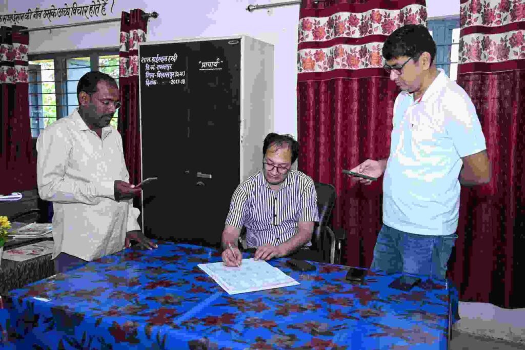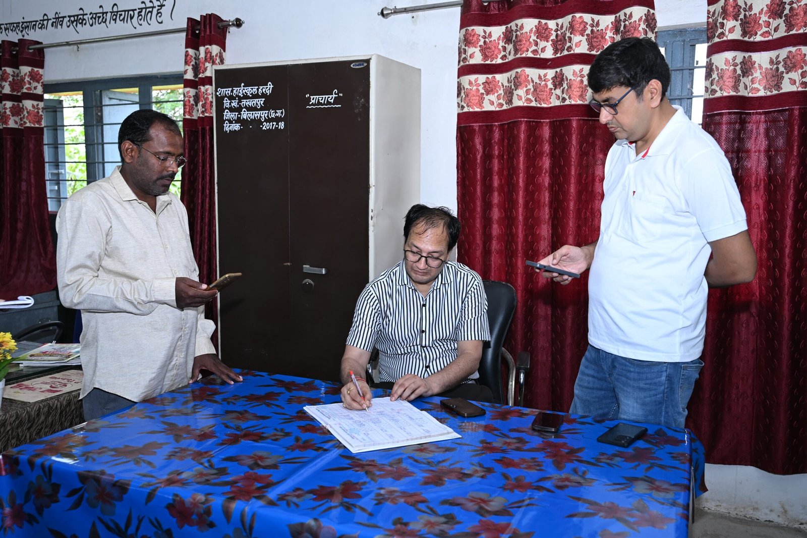 बिलासपुर:–स्वच्छता एवं सेवा अभियान के तहत तखतपुर विकासखण्ड के दौरे पर पहुंचे कलेक्टर संजय अग्रवाल ने आज हाई स्कूल हरदी का अचानक दौरा किया। जिला पंचायत के सीईओ संदीप अग्रवाल भी दौरे में साथ थे। बिना अवकाश स्वीकृति के प्रभारी प्राचार्य रमेश साहू एवं शिक्षक निर्मल शर्मा नदारद पाये गये। उनके विरूद्ध अनुशासनात्मक कार्रवाई के लिए जिला शिक्षा अधिकारी को शो-कॉज नोटिस जारी करने के निर्देश दिए। स्कूल के अंदर और बाहर गंदगी का आलम देख कलेक्टर बेहद नाराज हुए। उन्होंने विशेष स्वच्छता अभियान चलाकर संपूर्ण परिसर को साफ-सफाई करने की सख्त लहजे में हिदायत दी।