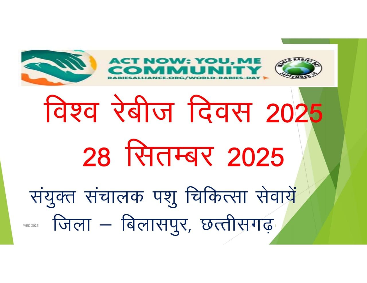 बिलासपुर:-रजत जयंती महोत्सव एवं विश्व रेबीज दिवस 28 सितम्बर 2025 के आयोजन अंतर्गत पशुधन विकास विभाग बिलासपुर द्वारा कुत्तों व बिल्लियों में निःशुल्क एण्टी रेबीज टीकाकरण का आयोजन किया गया है। शहर के सिटी कोतवाली थाने के समीप स्थित शासकीय जिला पशु चिकित्सालय, बिलासपुर में इस दिन सवेरे 07 बजे से दोपहर 01 बजे तक मुफ्त में टीका लगाया जाएगा। इसके लिए डॉ. ज्योत्स्ना दुबे (9993846733) और