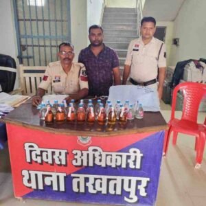 बिलासपुर:–जिले में अवैध शराब बिक्री पर रोक लगाने पुलिस द्वारा लगातार अभियान चलाया जा रहा है। इसी कड़ी में थाना तखतपुर पुलिस ने एक आरोपी को अवैध शराब बिक्री करते हुए गिरफ्तार किया है। आरोपी के कब्जे से देशी मदिरा की बोरी सहित कुल 5.400 लीटर शराब जप्त की गई है।