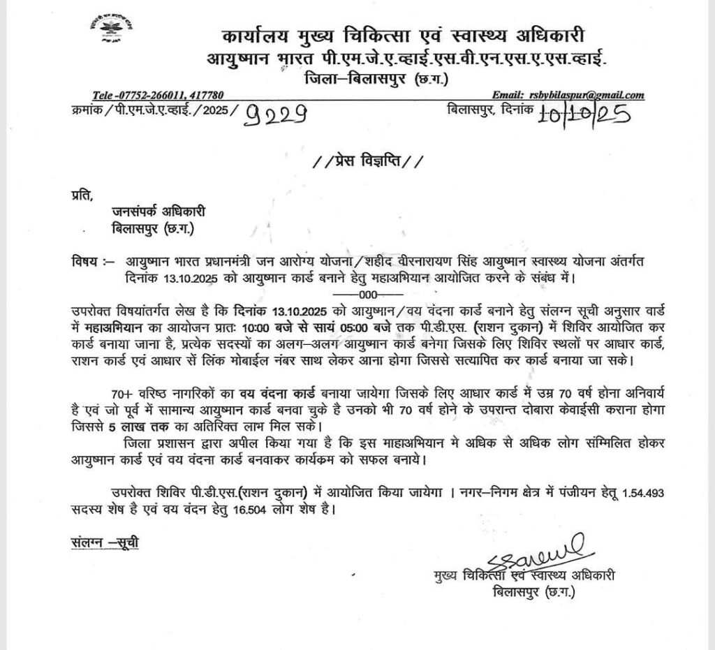 बिलासपुर:–आयुष्मान कार्ड बनाने 13 अक्टूबर (सोमवार) को एक दिवसीय विशेष महाअभियान आयोजित किया जा रहा है। इस दौरान नगर निगम क्षेत्र के विभिन्न वार्डों में स्थित राशन दुकानों में सवेरे 10 बजे से शाम 5 बजे तक शिविरों का आयोजन किया जाएगा, जिसमें पात्र हितग्राहियों के आयुष्मान कार्ड एवं 70 वर्ष से अधिक आयु के नागरिकों के वय वंदन कार्ड भी बनाए जाएंगे।