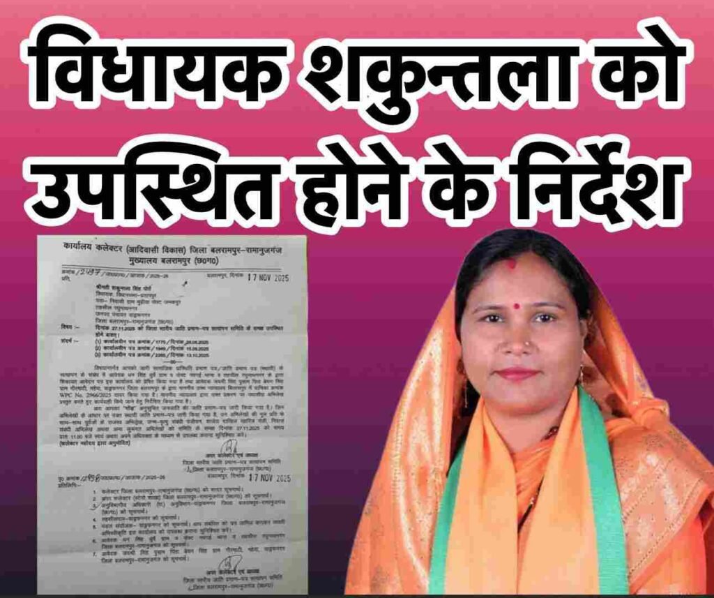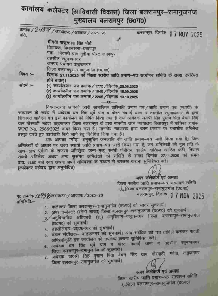 कलेक्टर कार्यालय (आदिवासी विकास), मुख्यालय बलरामपुर-रामानुजगंज (छ.ग.) से दिनांक 17 नवंबर 2025 को जारी एक महत्वपूर्ण पत्र के माध्यम से, श्रीमती शकुन्तला सिंह पोर्ते, विधायक, विधानसभा-प्रतापपुर को उनके जाति प्रमाण पत्र के सत्यापन के संबंध में जिला स्तरीय जाति प्रमाण पत्र सत्यापन समिति के समक्ष को उपस्थित होने का निर्देश दिया गया है।