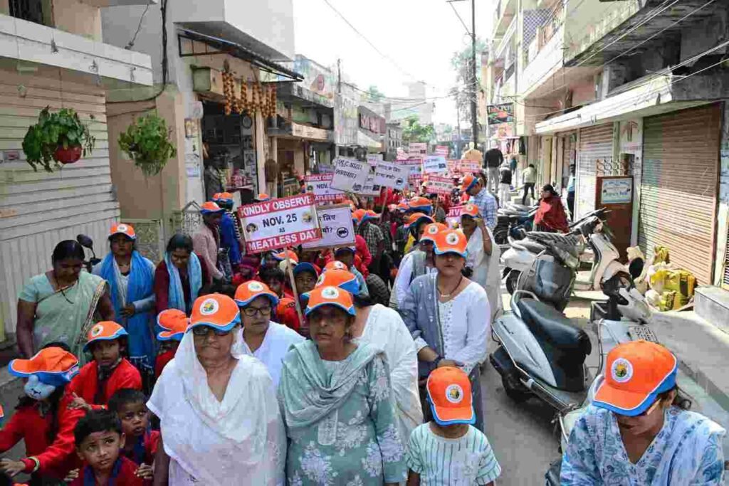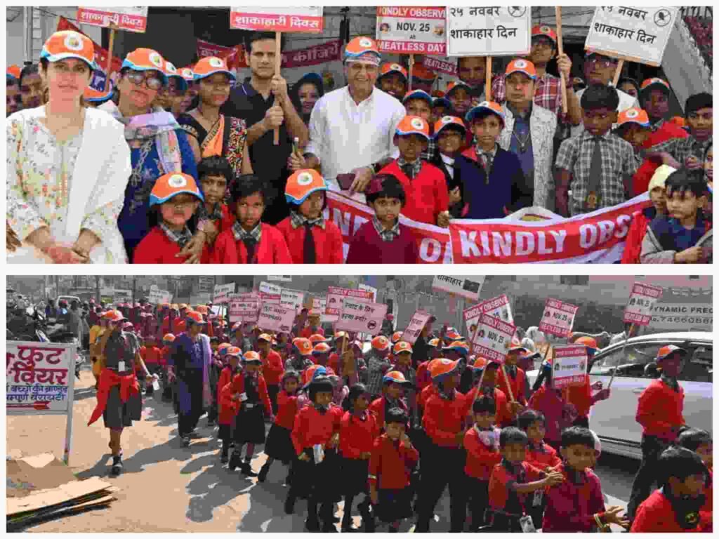 रैली में सबसे आगे स्कूल के बच्चों ने “शाकाहार अपनाओ, जीवन बचाओ” जैसे संदेश लिखे बैनर लेकर सहभागिता की। इसके पीछे महिलाओं द्वारा भजन-कीर्तन करते हुए जनजागरूकता संदेश दिए गए।