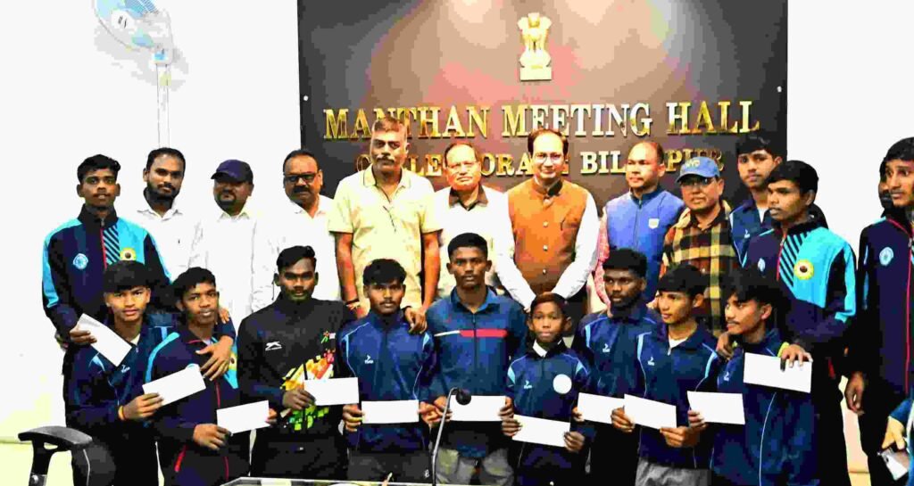 बिलासपुर:–राष्ट्रीय स्तर की प्रतियोगिताओं के लिए चयनित जिले के होनहार खिलाड़ियों को आज कलेक्टर श्री संजय अग्रवाल ने जिला कार्यालय में सम्मानित किया। नवीन पिछड़ा वर्ग बालक क्रीड़ा परिसर से चयनित इन खिलाड़ियों को कलेक्टर ने नगद प्रोत्साहन राशि प्रदान कर उनका उत्साहवर्धन किया।