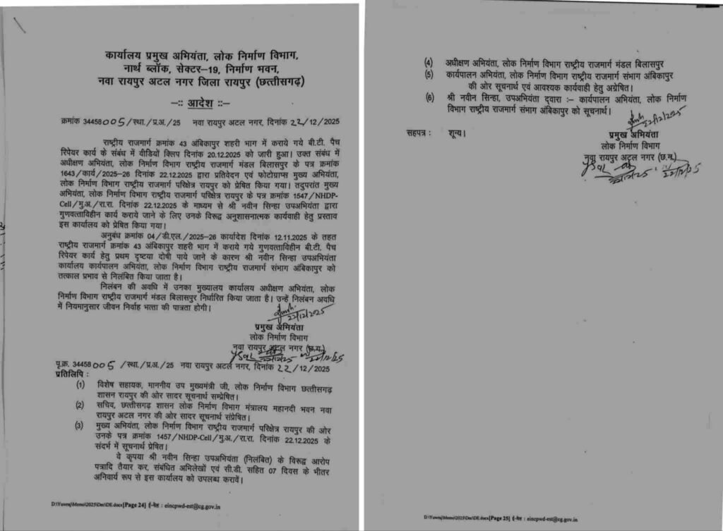 लोक निर्माण विभाग ने गुणवत्ताहीन कार्य पर कड़ी कार्रवाई करते हुए उप अभियंता श्री नवीन सिन्हा के तत्काल प्रभाव से निलंबन का आदेश आज जारी कर दिया है। निलंबन की अवधि में उनका मुख्यालय राष्ट्रीय राजमार्ग मंडल, बिलासपुर के अधीक्षण अभियंता कार्यालय निर्धारित किया गया है। निलंबन अवधि में उन्हें नियमानुसार जीवन निर्वाह भत्ता की पात्रता होगी।