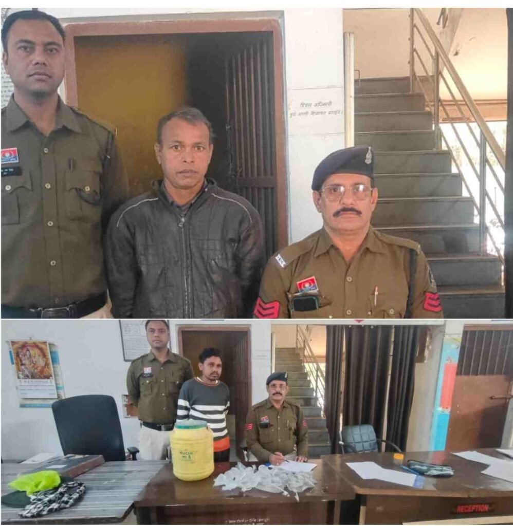 рджрд┐рдирд╛рдВрдХ 22 рдЬрдирд╡рд░реА 2026 рдХреЛ рдореБрдЦрдмрд┐рд░ рдХреА рд╕реВрдЪрдирд╛ рдкрд░ рдЧреНрд░рд╛рдо рдкреЛрдбреА рдмрд╛рдЬрд╛рд░ рдЪреМрдХ рдХреЗ рдкрд╛рд╕ рд░реЛрдб рдХрд┐рдирд╛рд░реЗ рдЕрд╡реИрдз рд░реВрдк рд╕реЗ рдорд╣реБрдЖ рд╢рд░рд╛рдм рдмреЗрдЪ рд░рд╣реЗ рдЖрд░реЛрдкреА рд░рдореЗрд╢ рджрд╛рд╕ рдорд╛рдирд┐рдХрдкреБрд░реА рдХреЛ рдШреЗрд░рд╛рдмрдВрджреА рдХрд░ рдкрдХрдбрд╝рд╛ рдЧрдпрд╛ред рдЙрд╕рдХреЗ рдХрдмреНрдЬреЗ рд╕реЗ 21 рд▓реАрдЯрд░ рдХрдЪреНрдЪреА рдорд╣реБрдЖ рд╢рд░рд╛рдм (рдХреАрдордд 4200 рд░реБрдкрдпреЗ) рдЬрдмреНрдд рдХреА рдЧрдИ рддрдерд╛ рдЙрд╕рдХреЗ рд╡рд┐рд░реБрджреНрдз рдЕрдкрд░рд╛рдз рдХреНрд░рдорд╛рдВрдХ 48/2026 рдзрд╛рд░рд╛ 34(2) рдЖрдмрдХрд╛рд░реА рдПрдХреНрдЯ рдХреЗ рддрд╣рдд рдорд╛рдорд▓рд╛ рджрд░реНрдЬ рдХрд┐рдпрд╛ рдЧрдпрд╛ред