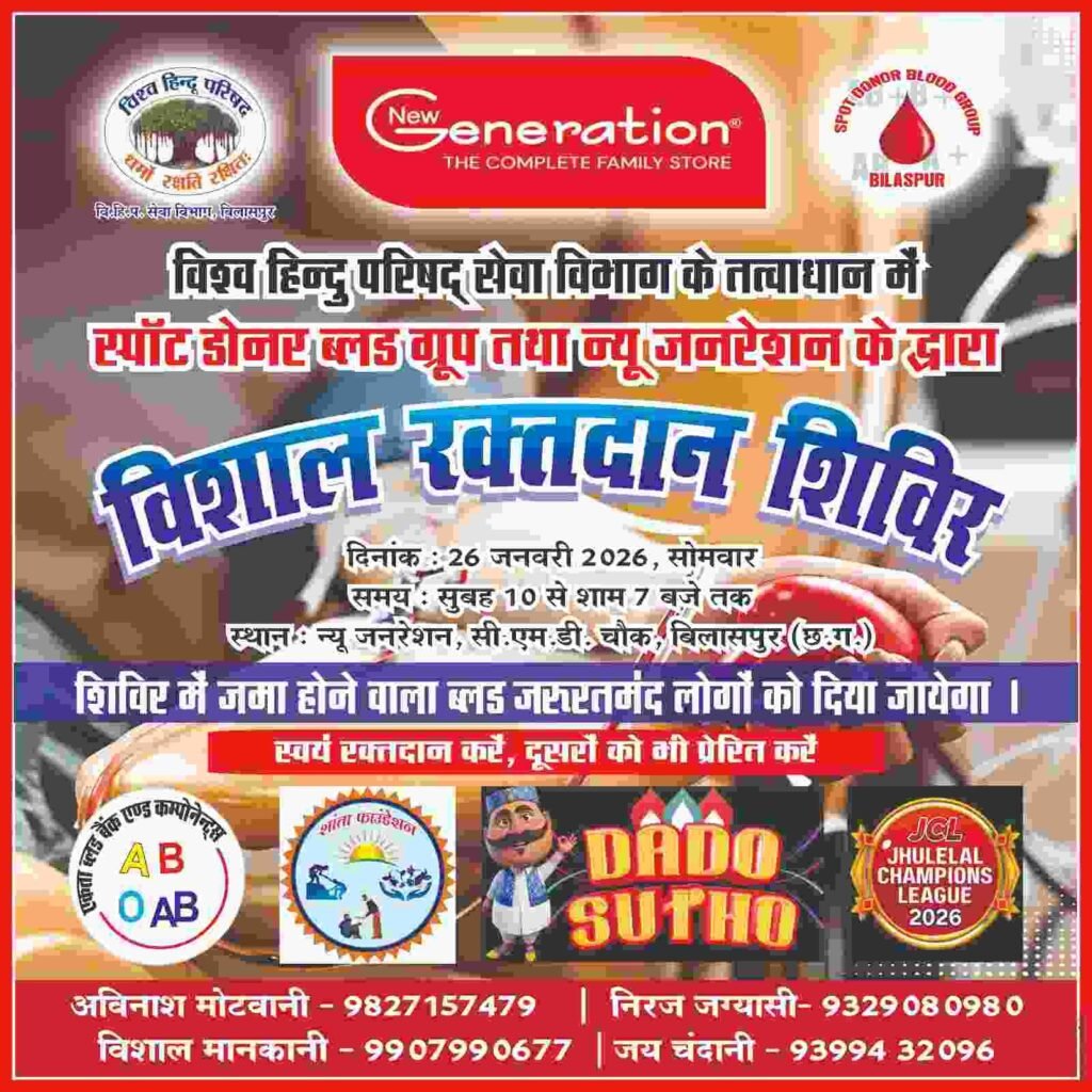 इस सफल आयोजन में विश्व हिंदू परिषद सेवा विभाग बिलासपुर, स्पॉट डोनर ब्लड ग्रुप एवं न्यू जनरेशन के सभी कार्यकर्ताओं का विशेष योगदान रहा, जिसके परिणामस्वरूप यह सेवा अभियान सुव्यवस्थित, प्रेरणादायी और सफलतापूर्वक संपन्न हुआ।
