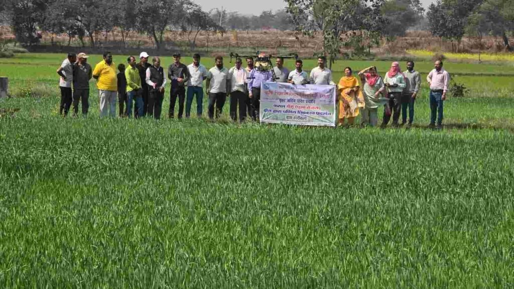 प्रदर्शन के अंतर्गत किसानों को उन्नत उत्पादन तकनीकों का प्रशिक्षण दिया जा रहा है, जिसमें सीड ड्रिल से कतार एवं क्रिस-क्रॉस बोआई, बीजों का कन्सोशिया से उपचार, 125 किग्रा प्रति हेक्टेयर बीज दर का उपयोग, संतुलित उर्वरक प्रबंधन एवं वैज्ञानिक जल प्रबंधन शामिल हैं। इसी क्रम में ड्रोन तकनीक के माध्यम से गेहूं में 19:19:19 उर्वरक एवं इफको द्वारा निर्मित नैनो डीएपी का पर्णीय छिड़काव कर किसानों को आधुनिक कृषि की दिशा में प्रेरित किया गया।