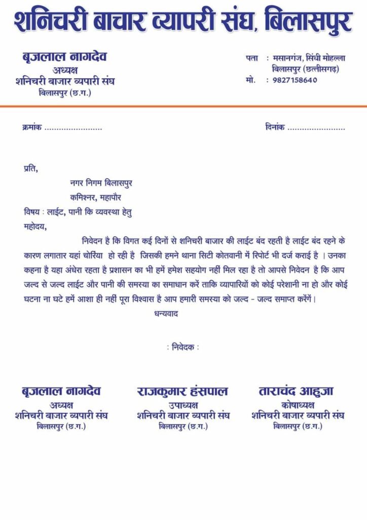 बिलासपुर। लगातार हो रही चोरी की घटनाओं से दहशत में आए शनिचरी बाजार के व्यापारियों ने आखिरकार अपनी आवाज बुलंद कर दी। सोमवार को शनिचरी बाजार व्यापारी संघ के सदस्यों ने एकजुट होकर बिलासपुर महापौर पूजा विधानी और नगर निगम कमिश्नर प्रकाश कुमार सर्वय से मुलाकात कर बाजार की गंभीर समस्याओं से अवगत कराया और ज्ञापन सौंपकर त्वरित समाधान की मांग की।