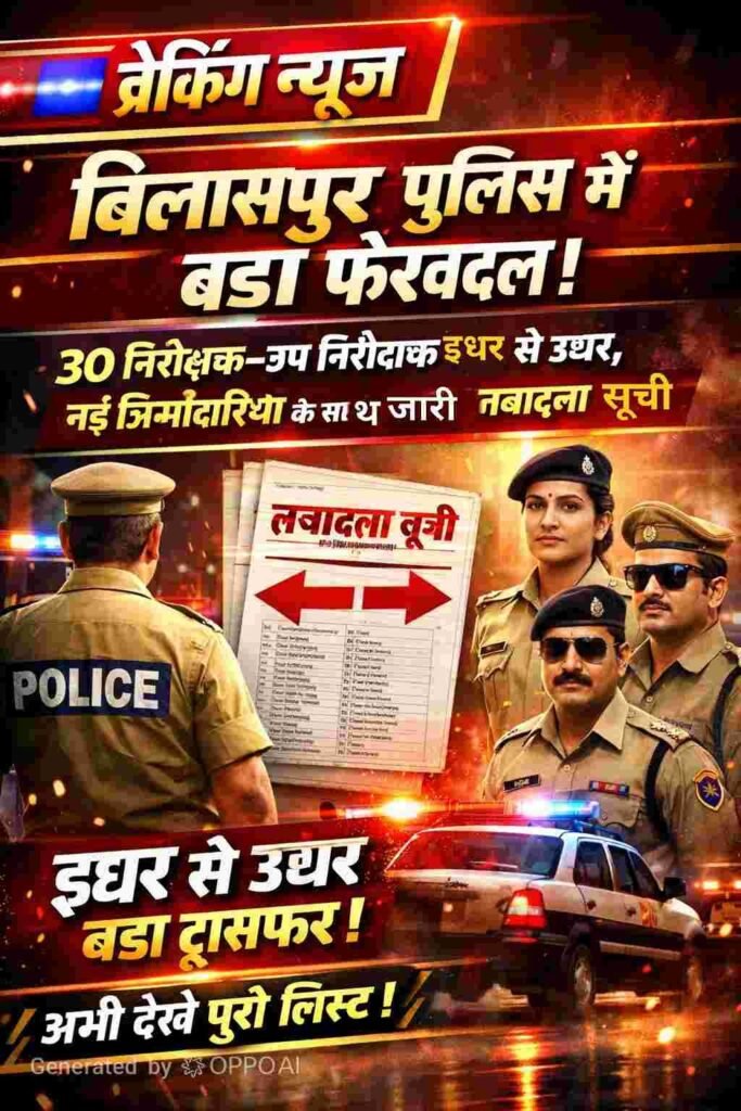 बिलासपुर -बिलासपुर जिले को कई अनुभवी अधिकारियों की सेवाएं मिली हैं।निरीक्षक कमला पूसाम को रायगढ़ से बिलासपुर स्थानांतरित किया गया है। वे पूर्व में धरमजयगढ़ थाना प्रभारी रह चुकी हैं और महिला संबंधी मामलों में उनकी सक्रिय भूमिका रही है।वही मस्तूरी थाना में वर्तमान प्रभारी अजहरुद्दीन को रायपुर नगरीय निकाय में सेवा देने के लिए नई जिम्मेदारी मिली वही यशवंत प्रताप सिंठ को भी रायपुर से बिलासपुर भेजा गया है।इससे सभी जिले में पुलिस व्यवस्था और अधिक मजबूत होने की उम्मीद जताई जा रही है।रायगढ़, दुर्ग और अन्य जिलों में भी