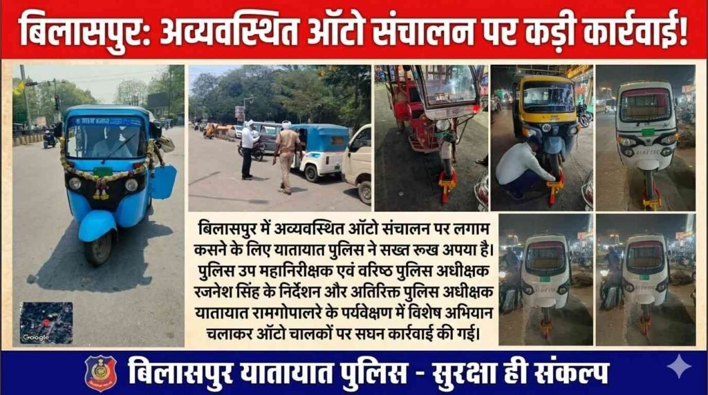 बिलासपुर में अव्यवस्थित ऑटो संचालन पर लगाम कसने के लिए यातायात पुलिस ने सख्त रुख अपनाया है। पुलिस उप महानिरीक्षक एवं वरिष्ठ पुलिस अधीक्षक रजनेश सिंह के निर्देशन और अतिरिक्त पुलिस अधीक्षक यातायात रामगोपाल करियारे के पर्यवेक्षण में विशेष अभियान चलाकर ऑटो चालकों पर सघन कार्रवाई की गई।