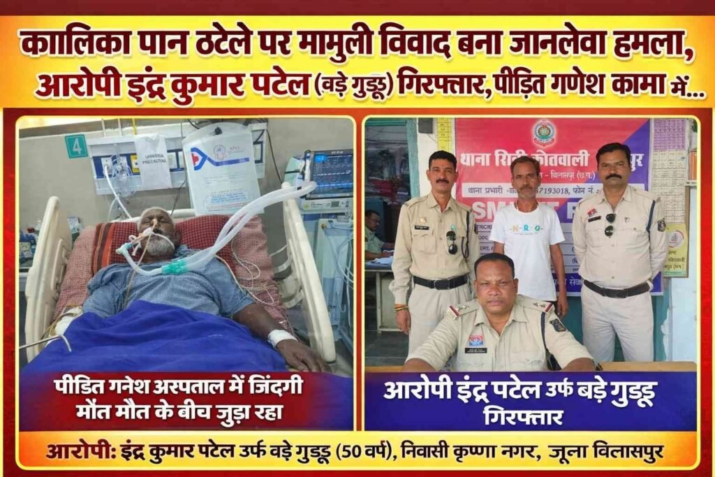 बिलासपुर:शहर के जूना बिलासपुर स्थित कालिका पान ठेला के पास हुए एक विवाद ने गंभीर रूप ले लिया, जहां मामूली कहासुनी के बाद आरोपी ने मारपीट कर एक व्यक्ति को गंभीर रूप से घायल कर दिया। घटना के बाद से पीड़ित अस्पताल में जिंदगी और मौत के बीच जूझ रहा है।