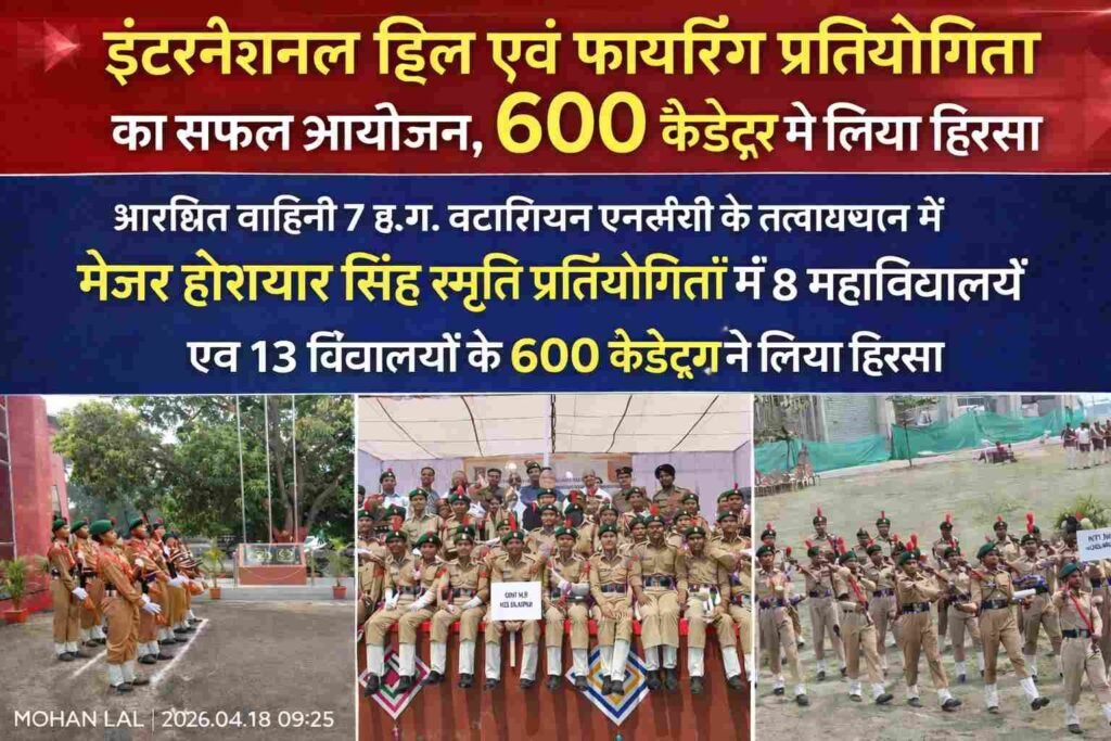 बिलासपुर। छत्तीसगढ़ आरक्षित वाहिनी (7 छ.ग. बटालियन) एनसीसी के तत्वावधान में शहर के जैन इंटरनेशनल स्कूल में मेजर होशियार सिंह स्मृति इंटरनेशनल ड्रिल एवं फायरिंग प्रतियोगिता का भव्य आयोजन किया गया। इस प्रतियोगिता में 8 महाविद्यालय एवं 13 विद्यालयों के लगभग 600 एनसीसी कैडेट्स ने उत्साहपूर्वक भाग लिया।