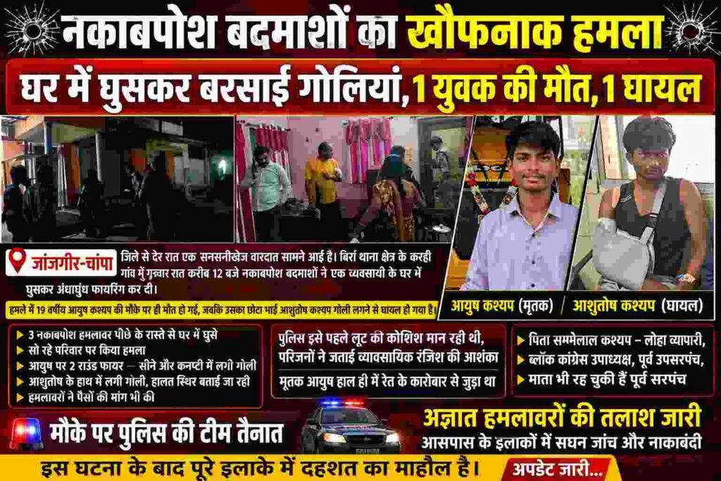 जांजगीर-चांपा। जिले के बिर्रा थाना क्षेत्र अंतर्गत करहि गांव में गुरुवार देर रात एक सनसनीखेज वारदात सामने आई है। यहां नकाबपोश बदमाशों ने एक व्यवसायी के घर में घुसकर अंधाधुंध फायरिंग कर दी, जिससे पूरे इलाके में दहशत फैल गई।