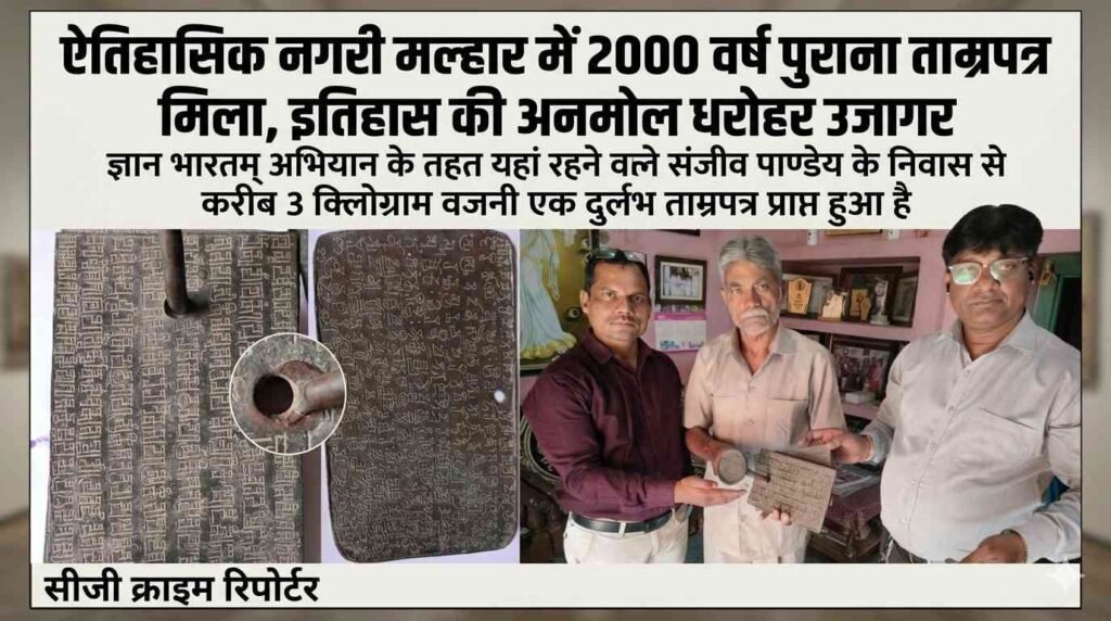 बिलासपुर:जिले के ऐतिहासिक नगर मल्हार में एक अत्यंत महत्वपूर्ण पुरातात्विक खोज सामने आई है। ज्ञान भारतम् अभियान के तहत यहां रहने वाले संजीव पाण्डेय के निवास से करीब 3 किलोग्राम वजनी एक दुर्लभ ताम्रपत्र प्राप्त हुआ है। इस ताम्रपत्र पर लगभग 2000 वर्ष पुरानी ब्राह्मी लिपि और पाली भाषा में लेख उत्कीर्ण पाए गए हैं, जिससे इसकी ऐतिहासिक और धार्मिक महत्ता कई गुना बढ़ गई है।